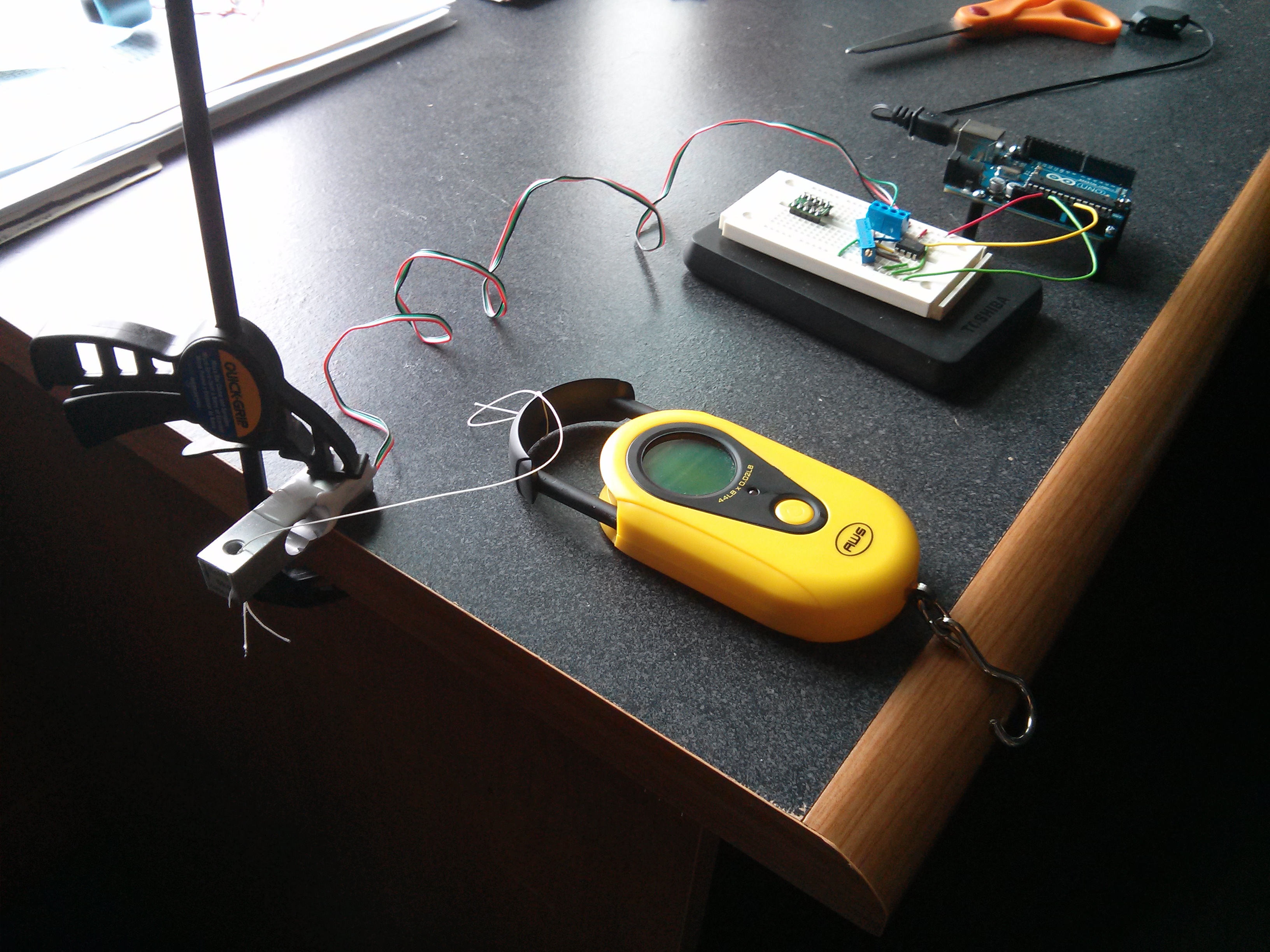 A failed setup to try to set the gain of the load cell circuit by clamping the load cell to a desktop and hanging weight from it. Large version.