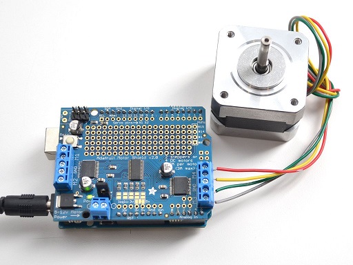 - Wire the MA-01: Adafruit Stepper motor to the motor shield as shown in Using Stepper Motors