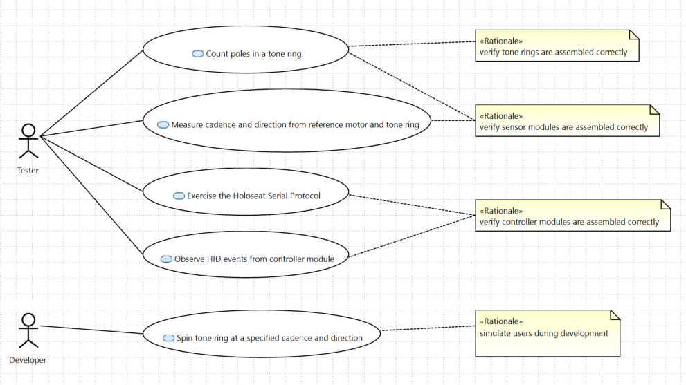 The following Use Case diagram documents the user stories for the Holoseat Test Stand. You can read the diagram in the pattern of agile user stories using the following guide: